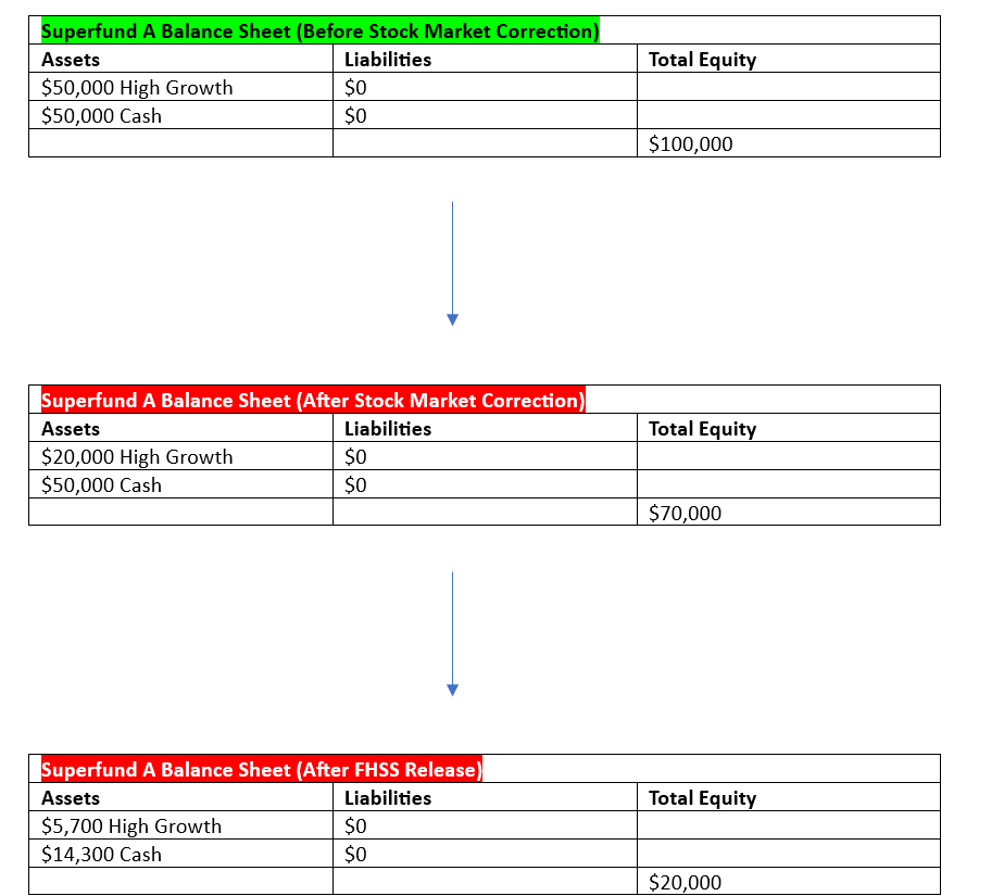 Suppose there is a big stock market crash and the high-growth investments plummet to $20,000, a 60% drop. You may only want to use the $50,000 cash option for the FHSS, but the release is apportioned. While you can rebalance the portfolio after the release, this crystalises the losses in the high growth allocation. It therefore hinders returns during the recovery of the stock market, since the superfund now holds fewer units of the high growth shares.