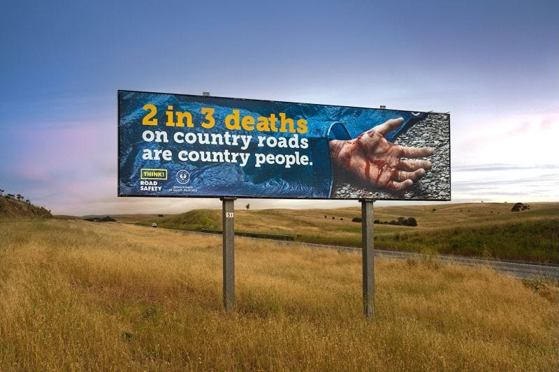 If 2/3 deaths on country roads are country people, 1/3 deaths on country roads do not involve country people. It follows that to change this ratio, there must be proportionately fewer country-resident driver deaths and proportionately more non-country-resident driver deaths. This is fine if it is reflective of an absolute decrease in deaths, but if the absolute death toll remains the same or even increases, the ratio is irrelevant. Suppose out of 500 drivers per year, 400 are country-residents and 100 are not, and there are 100 deaths. Suppose out of this, country-residents make up 67 deaths, which is 0.1675% of 400, and the remaining 33 are from non-country residents, which is 33% of 100. This satisfies the 2/3 ratio of country road deaths being country people, but it is highly misleading. Assuming that the death rate remains the same, doubling the number of non-country resident drivers would (1) increase the death toll and (2) simultaneously reduce the ratio of country resident road deaths. It also illustrates the opposite of what this ratio in the road sign predicts.
