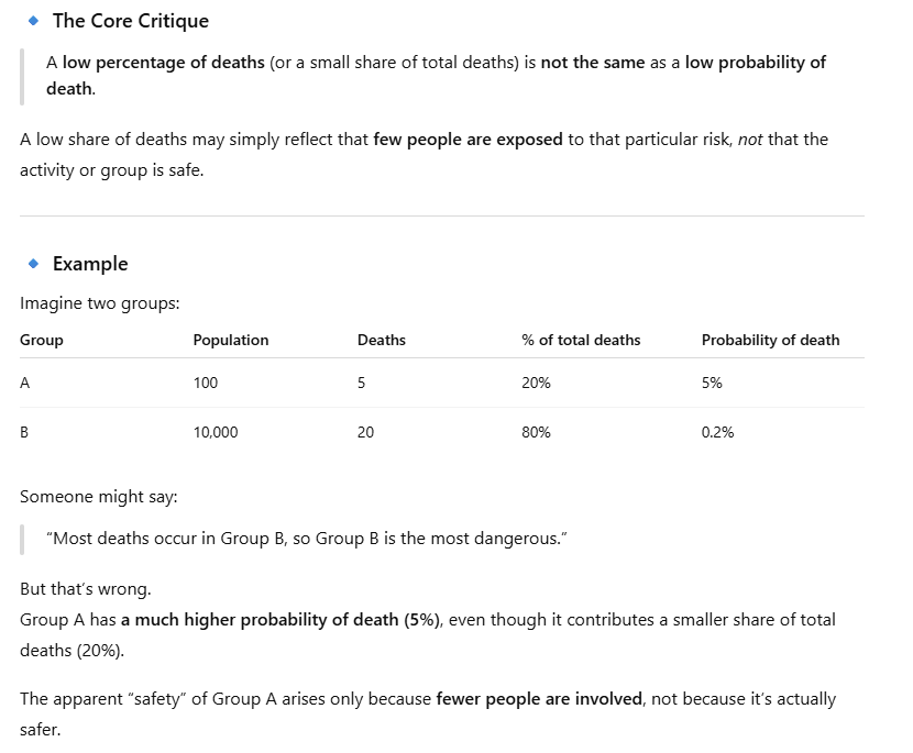 The crux of this critique is not to confuse a low % death rate with a low probability of it happening. The low % may merely reflect a small population of the people involved in that particular incident.