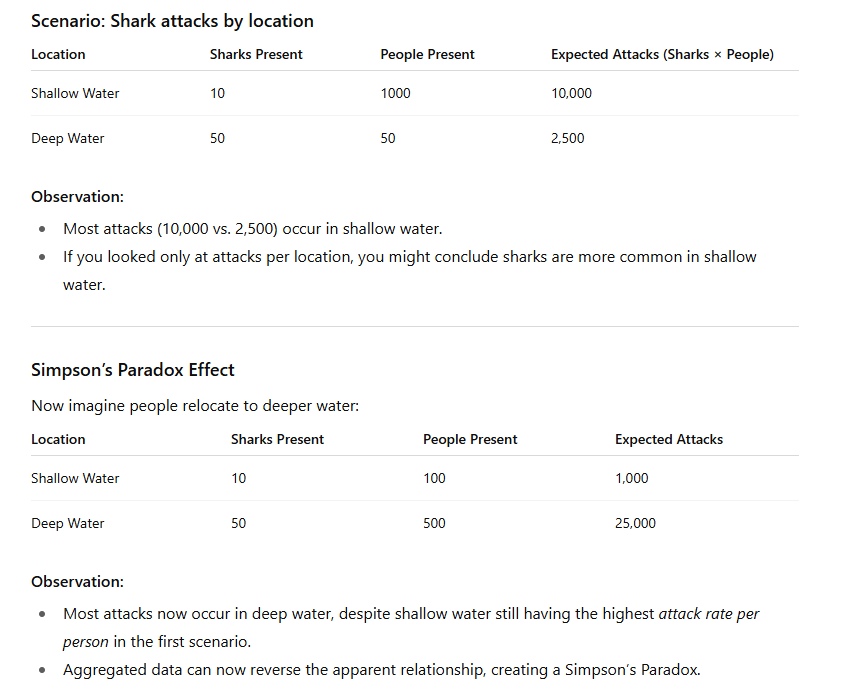 This is similar to the ‘sharks in shallow waters’ fallacy. To the extent that most shark attacks occur in shallow waters, this is not a reflection of where most sharks are but of where most people are. We risk creating a ‘Simpson’s Paradox’ if most people instead of being in the safe shores, relocate to where there are more sharks.