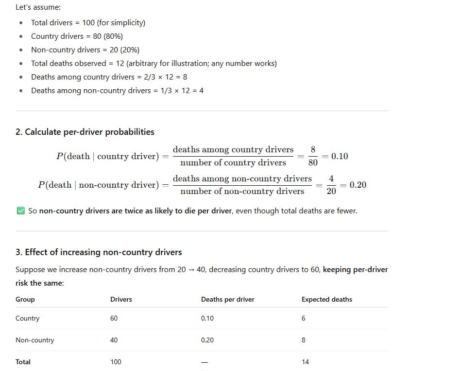 It is for this reason that if we adjust the cohorts - increase the number of, say, non-country people driving on country roads, there will be an increase in deaths and not a decrease, assuming that the 2/3 deaths statistic holds and that country drivers are less likely to be in car fatalities.